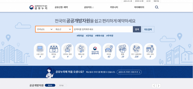 공유누리는 행정안전부와 조달청이 구축해 지난 3월 정식 개방한 온라인 공공자원 공유포털로, 전국 지자체와 공공기관의 시설과 물품 등 국민이 사용할 수 있는 공공개방 자원을 검색하고 이용할 수 있는 사이트다.