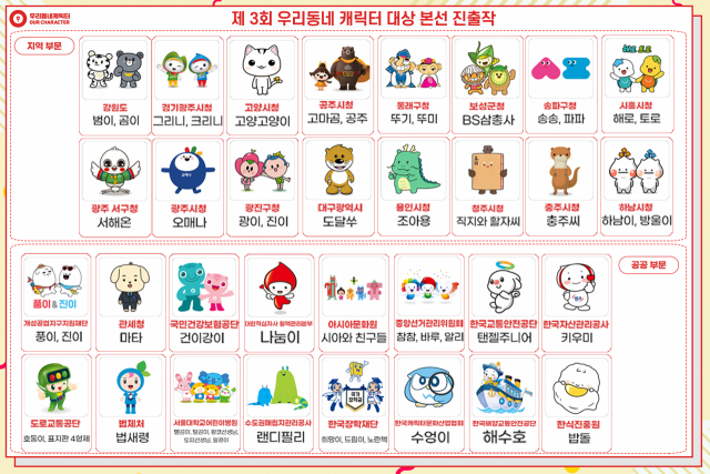 이번 제3회 우리동네 캐릭터 대상은 역대 최고 접수율을 기록하며, 총 100개의 지역·공공 캐릭터가 예선전을 치렀다. 이 중 일반인 대상 온라인 투표와 전문가 심사를 거쳐 지역 부문 16개, 공공 부문 16개의 개성 넘치는 캐릭터가 선발돼 본선 투표에 올랐다.