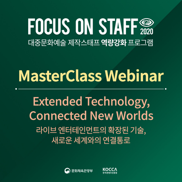 문화체육관광부(장관 박양우)와 한국콘텐츠진흥원(원장 김영준, 이하 콘진원)은 오는 10월 12일, 13일 양일간 대중문화예술 제작스태프 역량강화 프로그램 <Focus on Staff 2020>의 ‘마스터클래스 웨비나(Webinar, 웹 세미나)’를 개최한다.