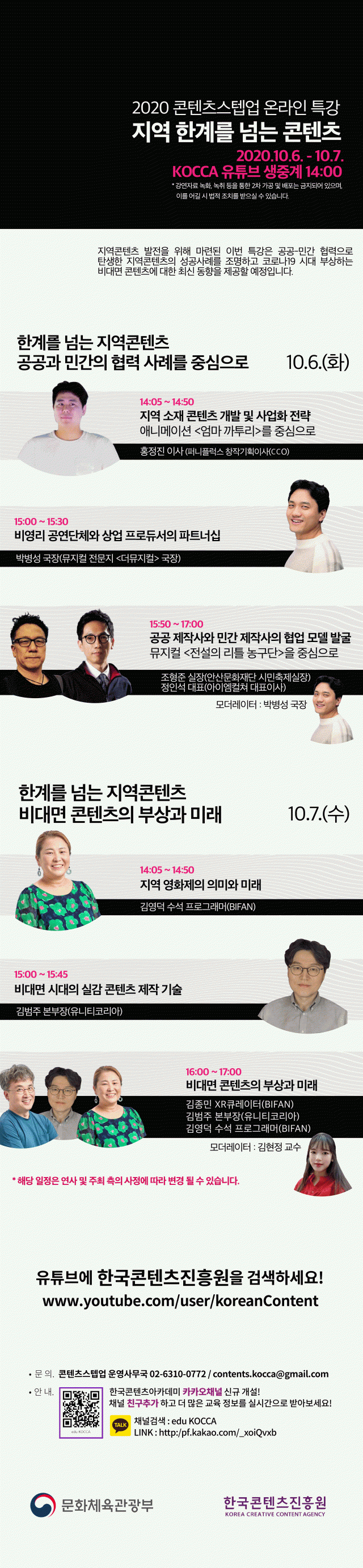이번 특강은 코로나19로 인해 비대면 온라인 강연으로 진행되며, 오는 6~7일 오후 2시부터 콘진원 공식 유튜브 채널을 통해 누구나 시청할 수 있다. 보다 자세한 세부 내용은 한국콘텐츠진흥원 누리집을 통해 확인할 수 있다.