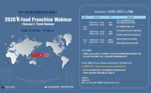 ‘2020 K-Food 프랜차이즈 웨비나’ 참가 등록 및 자세한 내용은 aT 홈페이지를 통해 확인할 수 있다.