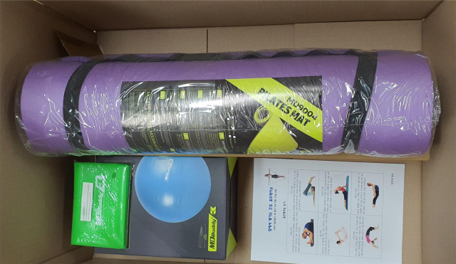 제공한 홈트 체험 꾸러미에는 안전과 층간소음을 방지하기 위한 무소음 운동기구로 짐볼, 요가매트, 밴드 3종으로 구성됐다.