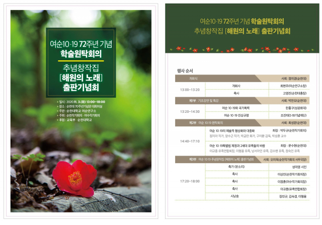 순천대학교(총장 고영진) 여순연구소가 3일(화) 오후 1시부터 6시까지 순천대학교 70주년기념관 대회의실에서 여순10·19 72주년을 기념해 학술원탁회의와 출판기념회를 개최한다고 밝혔다.