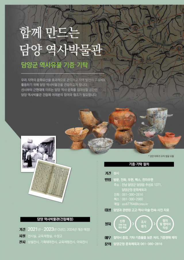 담양군(군수 최형식)이 담양 역사박물관 건립을 추진하고 있는 가운데 박물관에 전시할 유물자료의 기증·기탁 접수에 나섰다.