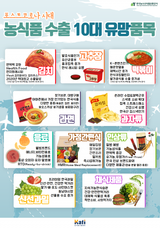 한국농수산식품유통공사(aT, 사장 이병호)는 19일 글로벌 식품시장 트렌드와 주 수출국 이슈조사를 통해 포스트 코로나 시대 ▶비대면·온라인시장의 급성장 ▶가정 내 식품 소비 증가 ▶건강에 대한 관심 증대 ▶지속가능한 소비확대 가능성 등을 중심으로 10개의 수출유망품목을 선정, 발표했다.