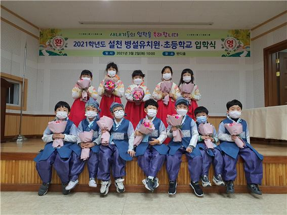 새로운 담임선생님과 첫 만남을 갖는 유치원생을 포함한 전교생 107명의 아이들은 모두 한복을 입고 등교해 시업식과 입학식에 참여했다.