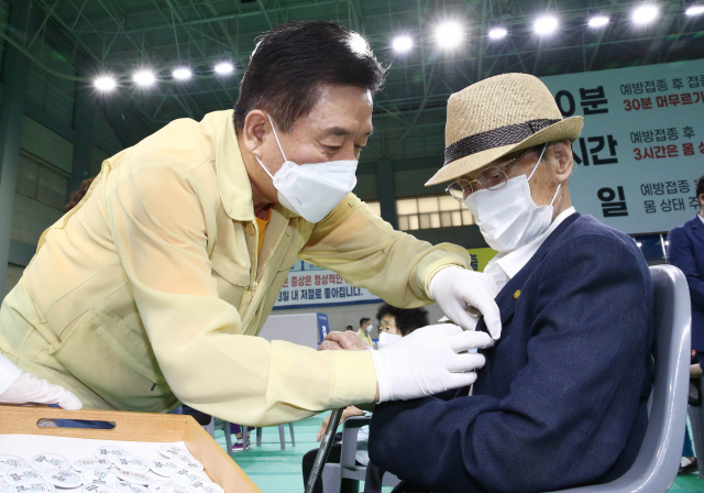 구충곤 화순군수가 예방접종센터에서 코로나19 백신 접종을 마친 어르신들에게 ‘백신접종 안심 배지’를 달아 줬다.