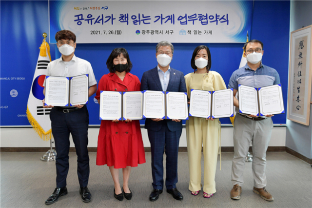 광주 서구가 소상공 영업장을 찾은 시민들이 책을 볼 수 있도록 지난 26일 ‘공유서가, 책 읽는 가게’ 협약식을 가졌다.