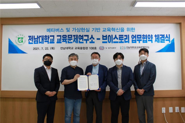 전남대 교육문제연구소(소장 류지헌 교수)는 ㈜브이스토리(회장 이영수)는 지난 7월 22일 업무협약을 맺고 유기적인 협력체계를 통해 메타버스 및 가상현실 기반의 교육 사업을 수행하고 이와 관련한 학술 연구를 상호 협력해 진행하기로 했다.