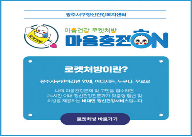 광주 서구(구청장 서대석)가 코로나19 장기화로 인한 사회적 고립감으로 우울감이나 무기력증 등을 겪는 시민의 마음건강 면역력을 강화하기 위해 서구 캐릭터인 ‘해온이’와 함께 비대면 정신건강 서비스 마음건강 로켓처방 ‘마음충전해ON’을 운영하고 있다.