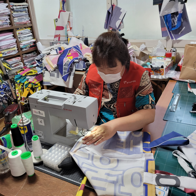 이렇게 모아진 폐현수막은 곧바로 월산동 자원봉사캠프에 전달됐고 자원봉사캠프에 몸담고 있는 주민들은 폐현수막을 오린 뒤 평소 재미 삼아 익혀온 재단과 봉제기술을 활용해 공유가방을 만들어 왔다.