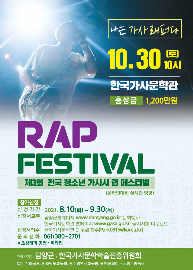 담양군(군수 최형식)은 오는 10월 30일 제3회 전국 청소년 가사시 랩 페스티벌을 개최한다고 17일 밝혔다.