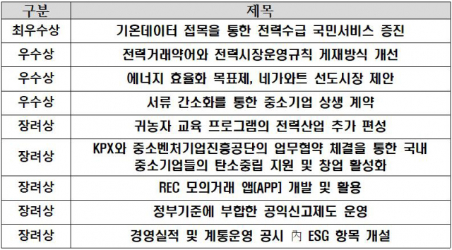 이외에도 우수상으로 ▲전력거래약어와 전력시장운영규칙 게재방식 개선 ▲에너지 효율화 목표제 네가와트 선도시장 제안 ▲서류 간소화를 통한 중소기업 상생 계약이 선정되었다. 장려상으로는 ▲귀농자 교육 프로그램의 전력산업 추가 편성 ▲REC 모의거래 앱 개발 및 활용 등이 선정되었다.
