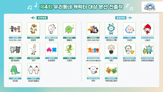이번 제4회 우리동네 캐릭터 대상은 가장 높은 접수율을 기록했으며 총 101개의 지역·공공 캐릭터가 예선전을 치렀다. 이중 일반인 대상 온라인 투표와 전문가 심사를 거쳐 지역 부문 10개, 공공 부문 10개의 개성 넘치는 캐릭터가 본선 투표에 올랐다.