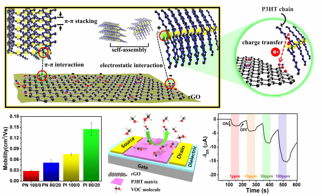 천형준, 신서영 학생은 자외선 영역의 광 조사 방법을 통해 공액 고분자의 자기조립을 유도할 수 있고 또한 공액 고분자와 산화 그래핀 사이의 전하이동 상호작용을 크게 향상시킬 수 있음을 체계적으로 규명하고 나아가 이렇게 제조된 복합재료를 박막의 형태로 유기 전계효과 트랜지스터 기반 가스 센서에 응용했다.
