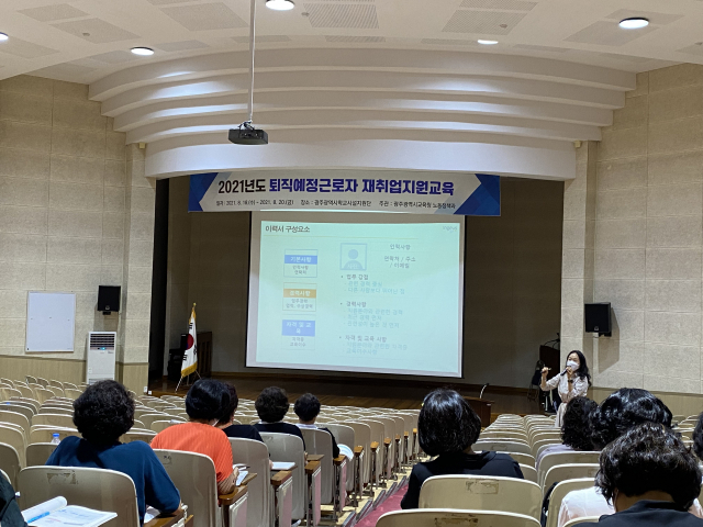 광주시교육청이 지난 18일부터 사흘 동안 광주학교시설지원단에서 ‘2021년도 퇴직예정근로자 재취업지원교육’을 실시했다.
