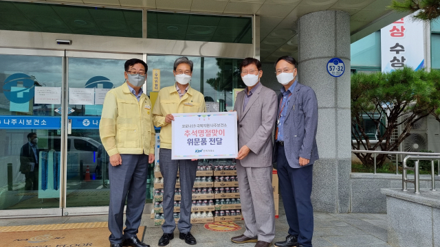 이렇게 구매한 물품과 함께 직원들의 자발적 성금과 기관이 준비한 후원금으로 코로나19 지역 선별진료소인 나주시 보건소를 지원하고 자매결연 사회복지시설에도 행복한 명절이 될 수 있도록 후원을 아끼지 않았다.