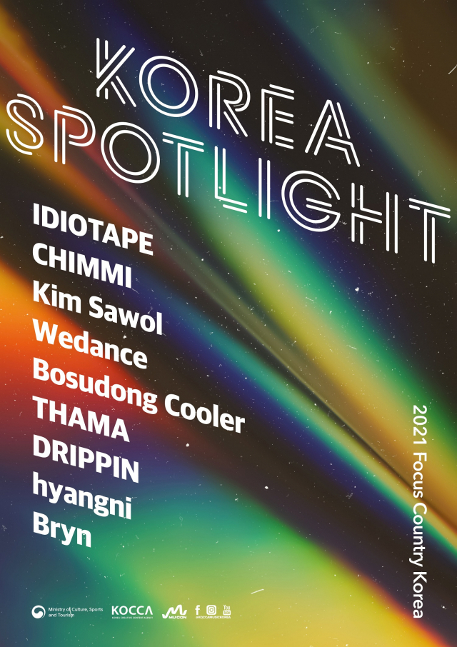 콘진원은 K팝 쇼케이스 ‘코리아 스포트라이트(Korea Spotlight)’를 진행하며 ▲드리핀 ▲브린 ▲이디오테잎 ▲김사월 ▲따마 ▲향니 ▲위댄스 ▲취미 ▲보수동쿨러 등 국내 뮤지션 9개 팀을 선보인다. 주빈국으로서 예년보다 확대된 규모로 뮤지션 소개에 나서며 뮤지션들의 특색을 살린 쇼케이스 영상을 통해 K팝의 다양한 매력을 알린다.