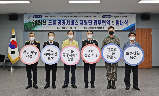 고흥군(군수 송귀근)은 29일 군청 팔영산홀에서 관내 공공기관(고흥경찰서, 고흥소방서, 여수해양경찰서, 육군7391-2부대)과 드론업체(마린로보틱스㈜)가 함께하는 드론 공공서비스 지원단 업무협약을 체결했다.