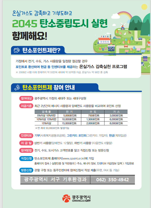 광주 서구(구청장 서대석)가 가정 내 온실가스 감축 및 2045탄소중립도시 실현을 위한 탄소포인트제 가입률을 높이기 위해 적극적인 홍보에 나섰다.