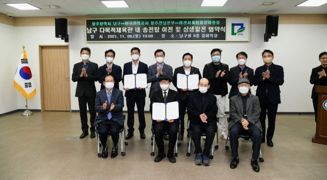 8일 남구에 따르면 이날 오전 구청 중회의실에서 김병내 구청장과 윤영덕 국회의원, 김상권 한전 광주전남본부장, 이천서씨 종중 회장 등이 참석한 가운데 ‘남구 다목적체육관 송전탑 이전을 위한 상생발전 협약식’이 열렸다.