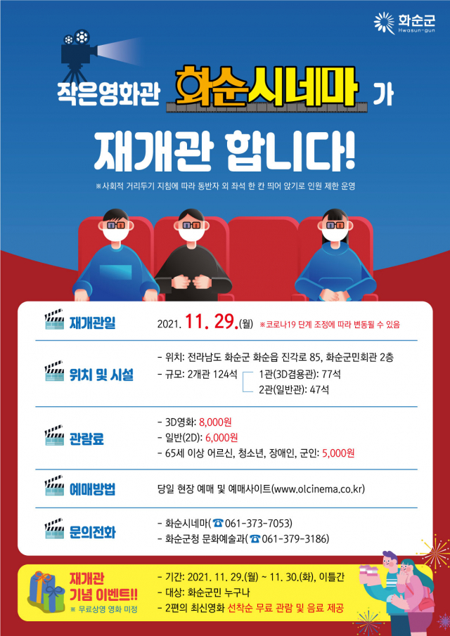 코로나19 여파로 2020년 2월부터 휴관 중인 작은영화관 화순시네마의 재개관도 앞두고 있다. 군은 지난 1일 전문업체와 위·수탁 운영 업무 협약을 맺고 오는 29일 재개관을 준비 중이다.