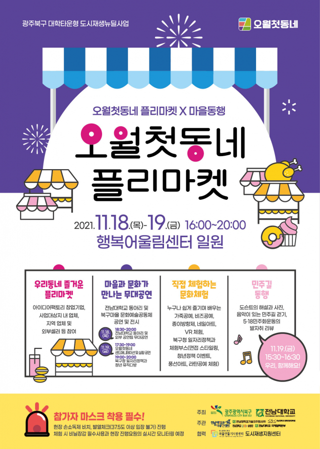 전남대학교가 광주광역시 북구와 공동으로 11월 18~19일 이틀 동안 5·18 사적지 1호인 전남대 정문과 북구 행복어울림센터 일원에서 ‘오월 첫 동네’ 플리마켓을 열고 민주길 걷기를 진행한다.