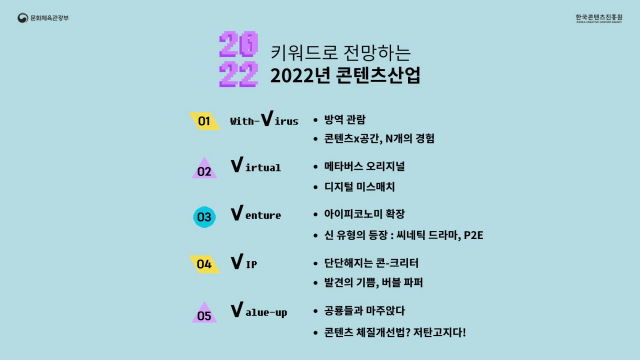 문화체육관광부(장관 황희)와 한국콘텐츠진흥원(원장 조현래, 이하 콘진원)은 12월 1일 ‘콘텐츠산업 2021년 결산과 2022년 전망 세미나’를 온라인으로 개최하고 내년을 전망하는 5개 키워드를 발표했다.