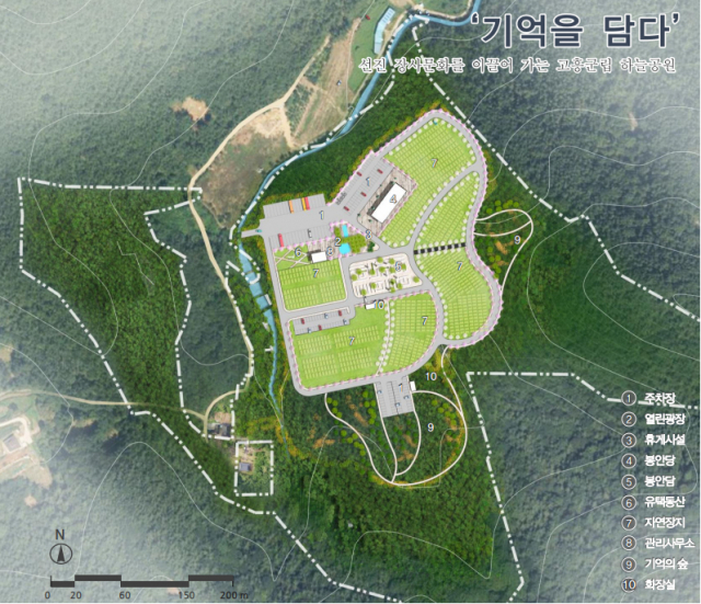 하늘공원의 전체 면적은 187,373㎡로 봉안당, 봉안담, 자연장지, 주차장, 관리사무소 등이 들어설 예정이며 원스톱 장례서비스를 제공하고 군민들에게 휴식공간을 제공해주는 공원기능도 병행토록 하는 새로운 개념의 장사시설로 조성할 계획이다.