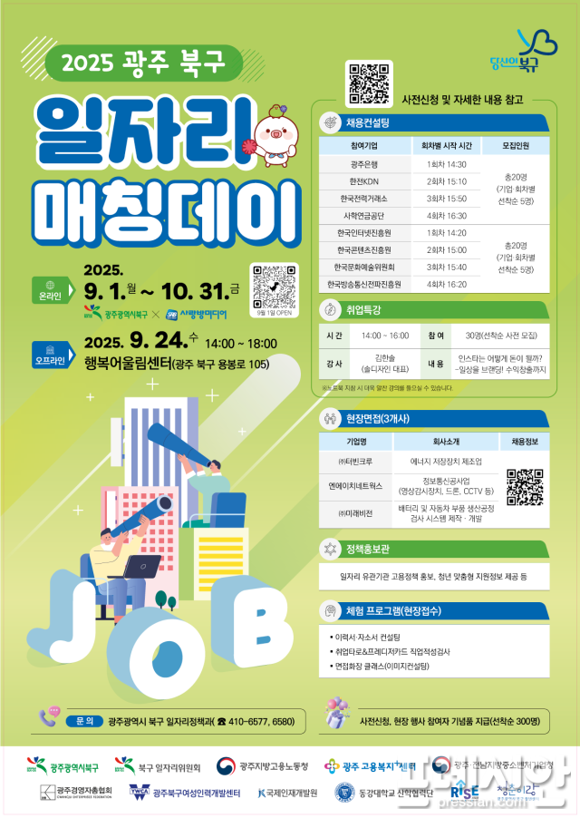 또한 채용 컨설팅은 ▲광주은행 ▲한국전력거래소 ▲한전KDN ▲한국인터넷진흥원 ▲한국문화예술위원회 등 8개 금융·공공기관에 종사하는 현직자들이 구직자들에게 기업 소개와 채용 일정, 직무 정보, 취업 노하우를 공유한다.