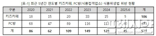 25일 전진숙 더불어민주당의원(광주북구을)이 식품의약품안전처로부터 제출받은 자료에 따르면, 최근 5년(2020~2025.6)간 키즈카페와 PC방의 식품위생법 위반 건수는 총 579건으로 집계됐다.