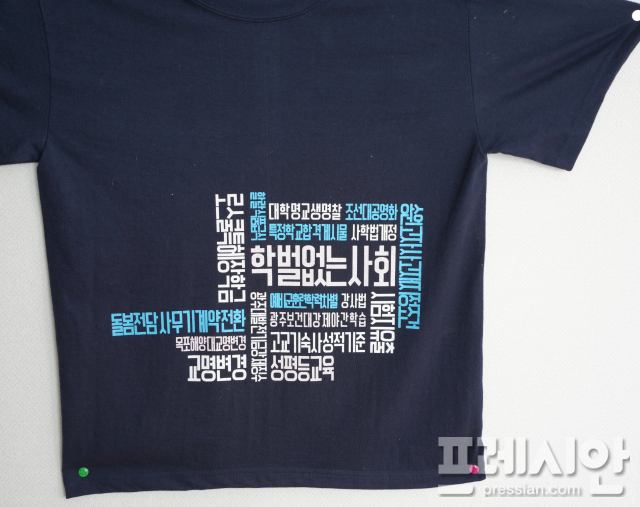 ▲학벌없는 사회를 위한 시민모임 사무실에 걸려 있는 시민모임 티셔츠에 그간의 활동들이 함께 프린팅 돼 있다.2025.09.30ⓒ프레시안(김보현)