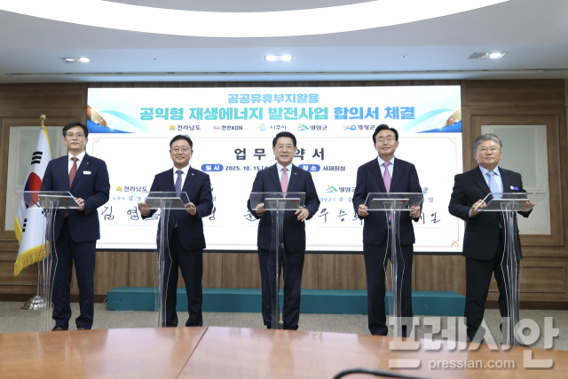 전남 영암군(군수 우승희)이 최근 전라남도, 나주시, 영광군, 한전KDN㈜과 함께 '공공 유휴부지 활용 공익형 재생에너지 발전사업 업무협약'을 체결했다.