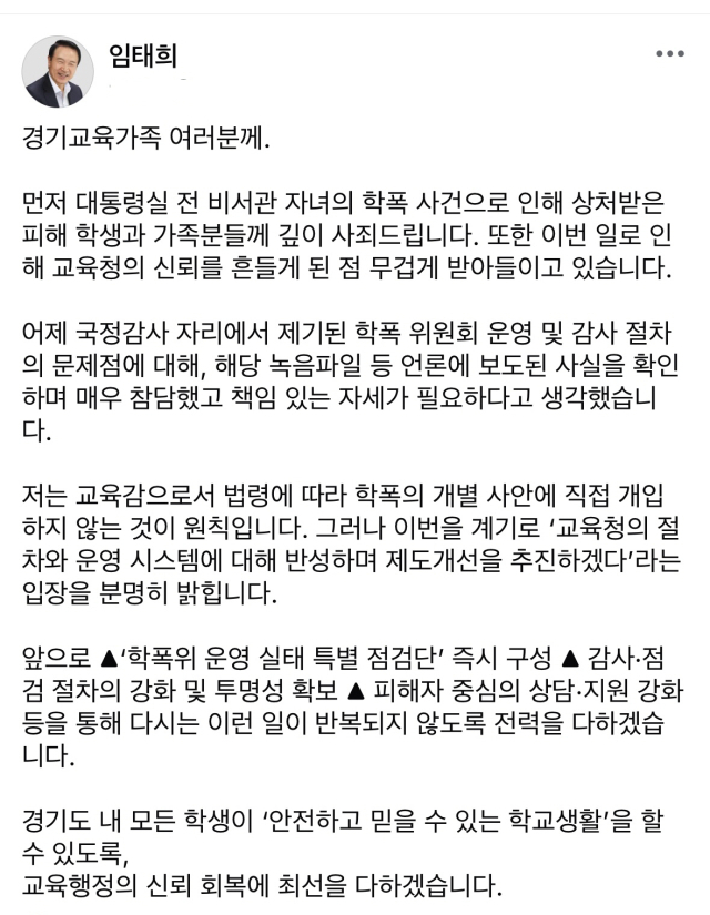 임 교육감은 이후 자신의 SNS를 통해 "대통령실 전 비서관 자녀의 학폭사건으로 인해 교육청의 신뢰를 흔들게 된 점 무겁게 받아들이고 있다"며 "국감에서 제기된 학폭위 운영 및 감사 절차의 문제점과 녹음파일 등 언론에 보도된 사실을 확인하며 매우 참담했고, 책임 있는 자세가 필요하다고 생각했다"고 밝혔다.