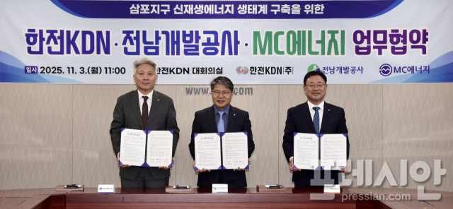 한전KDN은 전남개발공사, MC에너지와 함께 광주전남공동혁신도시 본사에서 '영암 삼포지구 신재생에너지 생태계 구축사업' 업무협약을 체결했다고 5일 밝혔다.