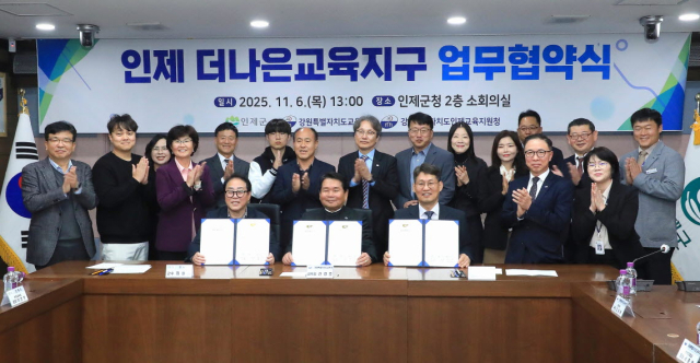 군은 최근 인제군청 소회의실에서 강원특별자치도교육청(교육감 신경호), 인제교육지원청(교육장 최수호)과 함께 ‘더나은교육지구 재지정(3기) 업무협약’을 체결했다.