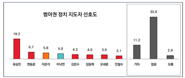 프레시안이 여론조사 전문기관 ㈜시그널앤펄스에 의뢰해 지난 7~8일 광주·전남에 거주하는 만 18세 이상 시도민 각 1008명과 1001명을 대상으로 실시한 조사에서 '범야권 정치 지도자로 가장 선호하는 인물은 누구인가'라는 질문에 광주와 전남 모두에서 유승민 전 의원이 1위를 차지했다. 다만 유보층(없음·모름)이 36.8%(광주)와 34.6%(전남)에 달했다.