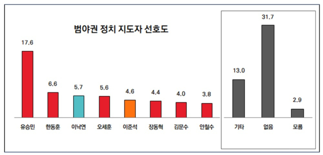 더불어민주당 지지층에서는 유승민 전 의원(20.7%)을 가장 선호했으며, 국민의힘 지지층에서는 장동혁 현 대표가 23.2%로 가장 높았다.