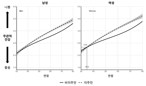 연령이 증가함에 따라 질병 발생 가능성이 증가하고 건강이 악화되기 때문에, 건강연구에서 연령은 가장 중요한 위험요인 중 하나이다. 오늘 소개한 논문은 연령 증가에 따른 건강 악화가 비이주민에 비해 이주민에서 더욱 가속화하는 것을 비이주민과 이주민의 생애 전반에 걸쳐 누적된 구조적 불평등의 결과로 설명했다. 특히 인상적인 것은 교육수준, 결혼상태, 소득수준과 같은 개인의 사회경제적 지위가 전반적인 건강 수준은 향상시키지만, 비슷한 사회경제적 지위를 가진 비이주민과 비교했을 때 이주민의 건강 악화가 가속화되는 문제를 막을 수 없었다는 점이었다.
