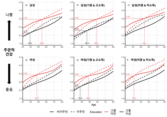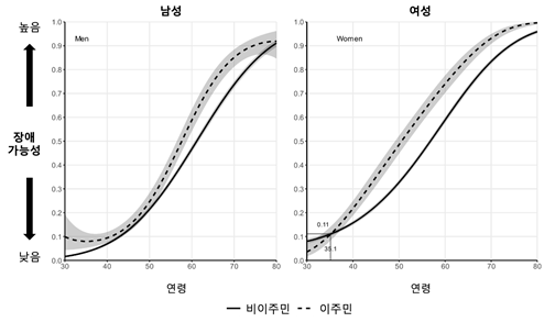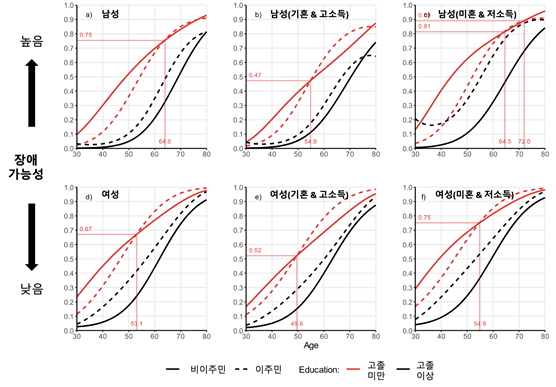 추가 세부 분석으로 교육 수준을 고등학교 졸업 미만과 고등학교 졸업 이상으로 구분하여 보았다. 교육 수준이 높을수록 전반적으로 건강 수준이 더 높았으나, 높은 교육 수준이 이민자의 건강 악화 속도를 완화하지는 않았다. 주관적 건강에서 고졸 이상 남성 이주민은 39.2세까지는 비이주민보다 나은 건강 결과를 보였으나, 고졸 이상 여성 이주민에서는 전 연령에서 비이주민보다 주관적 건강이 나빴다[그림3]. 장애 가능성에서는 남녀 모두 고졸 이상 이주민도 전 연령에서 비이주민보다 장애 가능성이 높았다[그림4]. 더불어 결혼 상태와 소득 수준을 고려했을 때도 이주민의 건강 악화에 대한 보호 효과는 확인되지 않았으나, 미혼이면서 저소득인 여성 이주민에서 건강 악화가 가속화된다는 점은 명료하게 확인되었다.