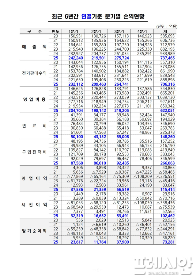 전기판매수익은 전년 동기 대비 3조 9037억 원 증가했으며, 자회사 연료비(2조 8151억 원)와 민간 구입전력비(2130억 원)가 각각 감소했다.