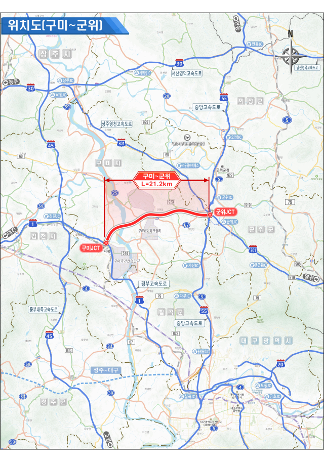 군위군은 27일 재정사업평가위원회 심의에서 구미~군위 고속도로가 최종 승인됐다고 밝혔다. 이 사업은 총연장 21.2km 구간에 4차로를 새로 구축하고, 분기점 2곳과 나들목 2곳을 포함하는 총사업비 1조 4천521억 원 규모의 대형 SOC 사업이다.