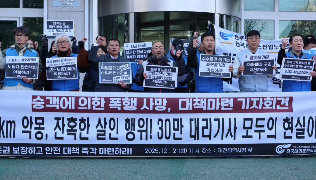 전국대리운전노동조합은 2일 대전광역시청 앞에서 기자회견을 열고 "대리운전노동자가 고객의 폭행으로 목숨을 잃는 끔찍한 사건이 발생했다"며 "대리기사 폭행 살인, 더 이상은 안 된다. 정부와 지방자치단체는 특단의 대책을 마련하라"고 촉구했다.