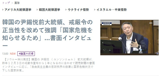 3일자 일본 요미우리신문에는 윤석열 전 대통령의 서면 인터뷰가 실렸다. 윤 전 대통령은 이 인터뷰를 통해 자신이 1년 전 선포한 비상계엄은 "국민을 억압하는 과거의 계엄과는 달랐다"면서 "몇 시간 만에 국회의 해제 요구를 받아들였다. 국회를 무력화할 의도는 없었다"고 주장했다.