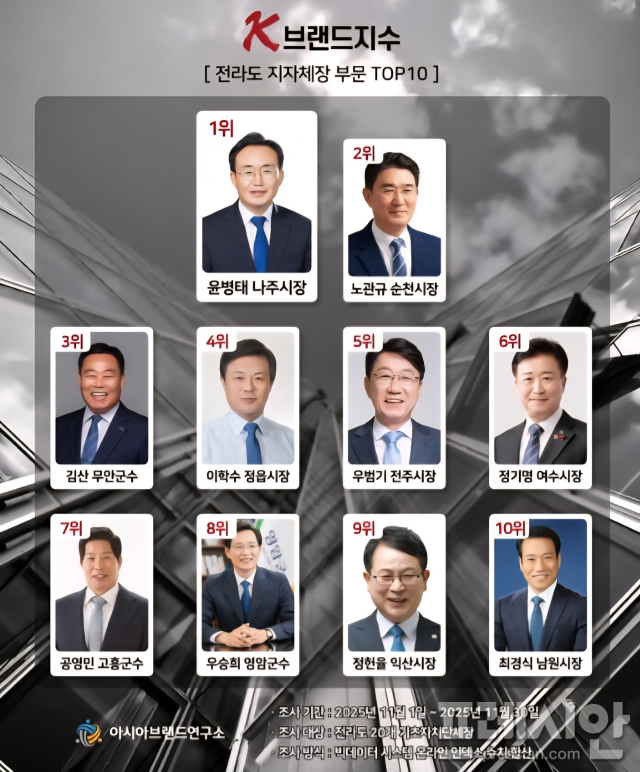 아시아브랜드연구소는 "이번 K-브랜드지수 전라도 지자체장 부문에서는 생활현안 대응과 지역경제 메시지가 온라인 여론에 빠르게 반영되는 흐름이 나타났다"며 "윤병태 나주시장이 1위에 오른 것은 단기 이슈보다 지속적인 정책노출과 공감대 형성이 결합된 결과로 해석된다"고 설명했다.