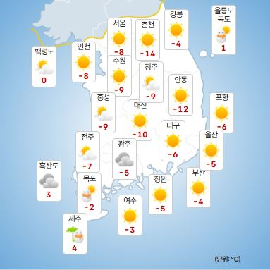 이날 낮 최고기온은 대전 2도, 세종·천안·청주 3도로 예보됐으며 아침 최저기온은 -10도 안팎까지 떨어지겠다.