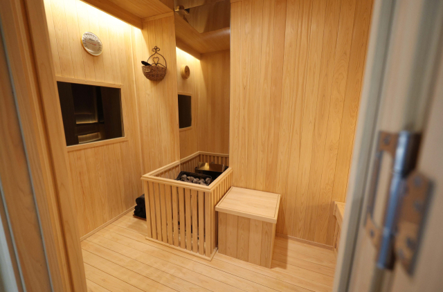 침실에 딸린 2평 남짓 사우나실은 편백나무 자재로 만들어진 건식 사우나 형태다. '사우나스토브', '사우나스톤', '5분 모래시계', 비상벨 등을 갖췄으며 사우나 의자 앞쪽에는 벽걸이 TV도 설치돼 있다. 사우나실 맞은 편에는 샤워 시설도 마련돼 있다.