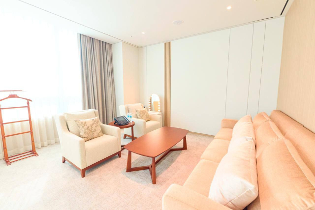 침실과 구분된 응접실에는 3인용 소파와 쿠션, 1인용 소파 2개가 나무 테이블을 사이에 두고 마주보도록 배치돼 있다. 전화기와 옷걸이도 보인다.