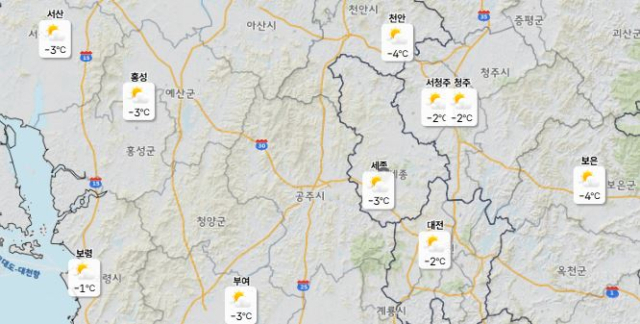 이날 낮 최고기온은 대전·세종·청주 3도, 천안 2도로 예상되며 아침 최저기온은 -3도 안팎에 머물 전망이다.