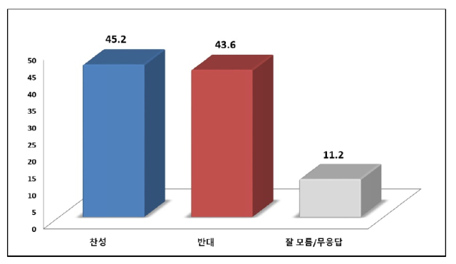 남성의 경우 찬성 51.1%, 반대 43.2%, 잘모름·무응답 5.7% 이며, 여성은 찬성 39.3%, 반대 44.0%, 잘모름·무응답 16.7%였다.